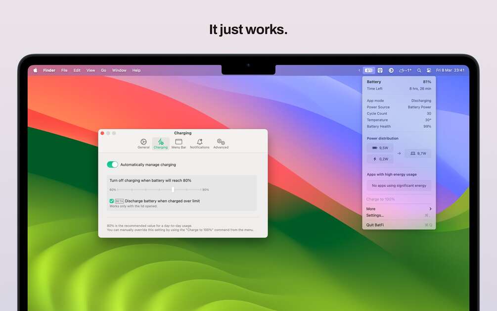 You set the limit once (e.g. 80%), and BatFi ensures your Mac stays below that line until you say otherwise. Want a full charge? Just click once. Done.